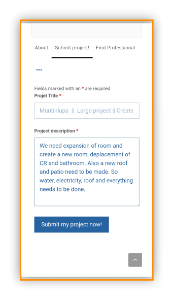 BahAyos Pro-Tip: Kunan ng litrato ang iyong proyekto gamit ang iyong cellphone at i-upload ang mga ito sa iyong kahilingan. Ang mga proyektong may kasamang litrato ay nakakakuha ng mas mabilis na tugon mula sa mga kwalipikadong propesyonal dahil mas matagumpay nilang matatantya ang saklaw, gastos, at timeline ng trabaho.
